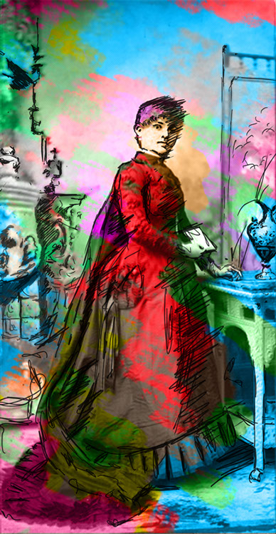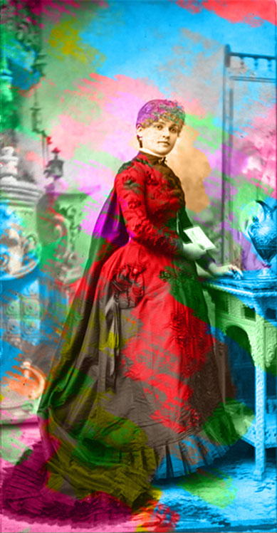 Coloration of the dress, mantel, table and vase were accomplished using a color adjustment layer.